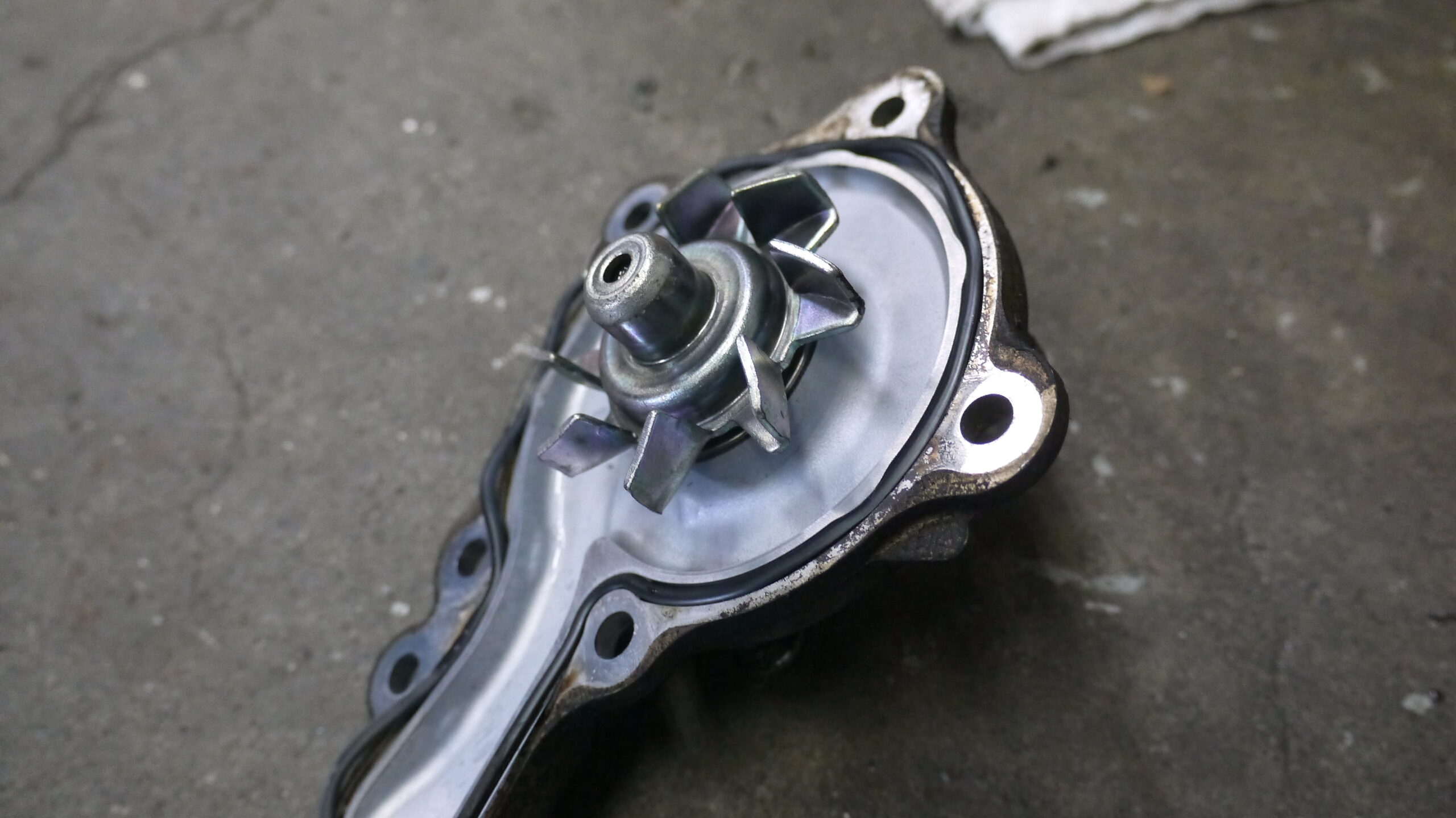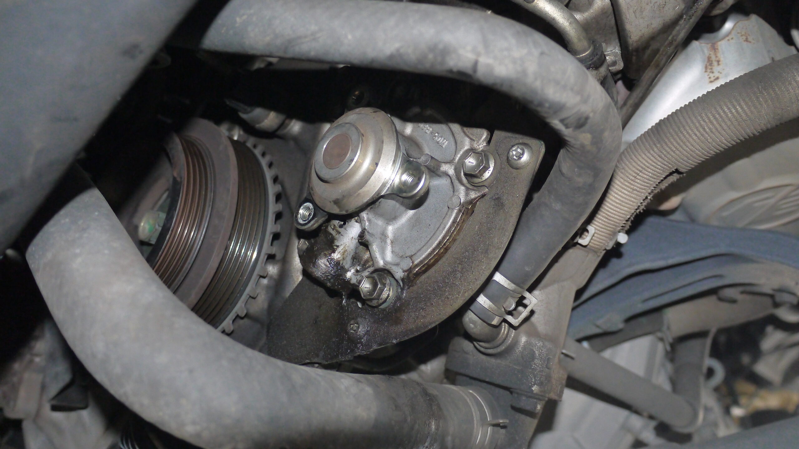 (外す直前のウォーターポンプです。異音に加えて、少し漏れもあります。)
