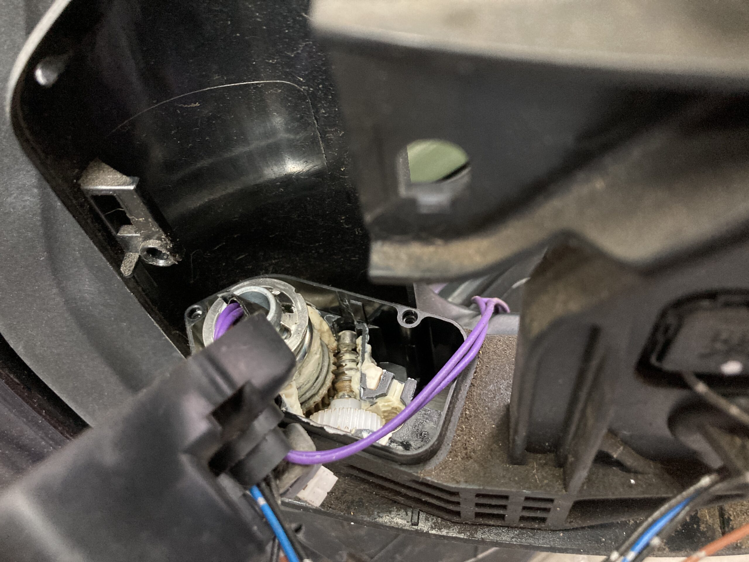 装備品の確認をしていると、ドアミラーが全く動かず、配線が抜かれている状態でした。配線を繋いでみると、格納モーターが空回りしていました。